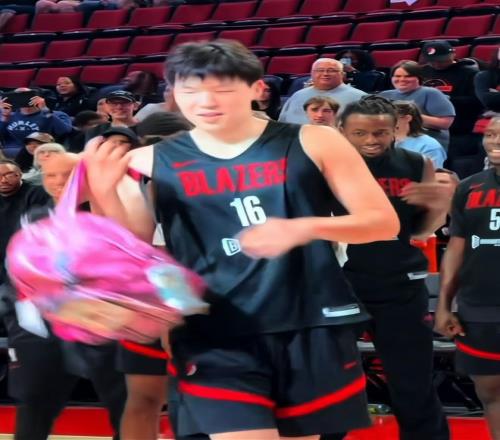 你有没有发现,最近杨瀚森总是背着一个粉红色的书包出现在镜头中。甚至当训练赛开场前,别的队友都在后面排队,只有杨瀚森背着粉红色的书包,在跟啦啦队学跳舞。